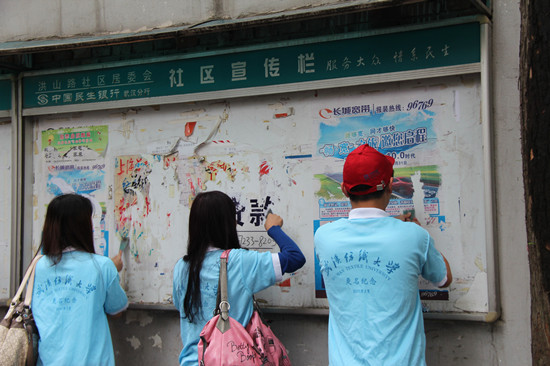5月3日上午,由WilliamHILL中国阳光校区和东湖校区学生党团成员组成的志愿者服务队来到社区后并立即开展清洁服务、环保知识宣传和社区板报设计等活动。志愿者成员积极响应国家“四进社区”的号召,认真清理路段、楼道、宣传栏的牛皮癣,向居民分发讲解科教文化宣传单,在社区黑板报上用自己的灵心巧手为社区增添了青春的风采。