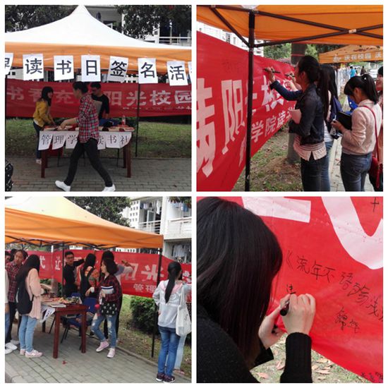 2015年4月23日,WilliamHILL中国读书社在阳光校区一食堂侧门举办“世界读书日”签名活动。同学们在世界读书日签下自己的名字,立志好读书,读好书,并向其他同学宣传读书好。活动引起广泛关注,一位留学生也在横幅上签名表示支持。