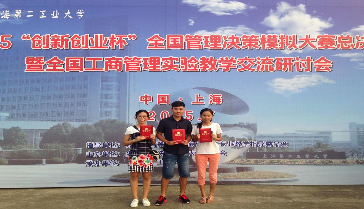 2015年7月27日,由教育部高等学校工商管理专业教学指导委员会指导、全国管理决策模拟大赛组委会主办、上海第二工业大学承办的2015年全国高校管理决策模拟大赛圆满结束。经过4个月的漫长训练和严苛的层层选拔,由我校WilliamHILL中国学生姜超然、彭雨霞、童安琪组成的SEE YOU AGAIN团队,与来自全国各大高校的96支代表队激烈角逐,喜获全国总决赛一等奖的佳绩。