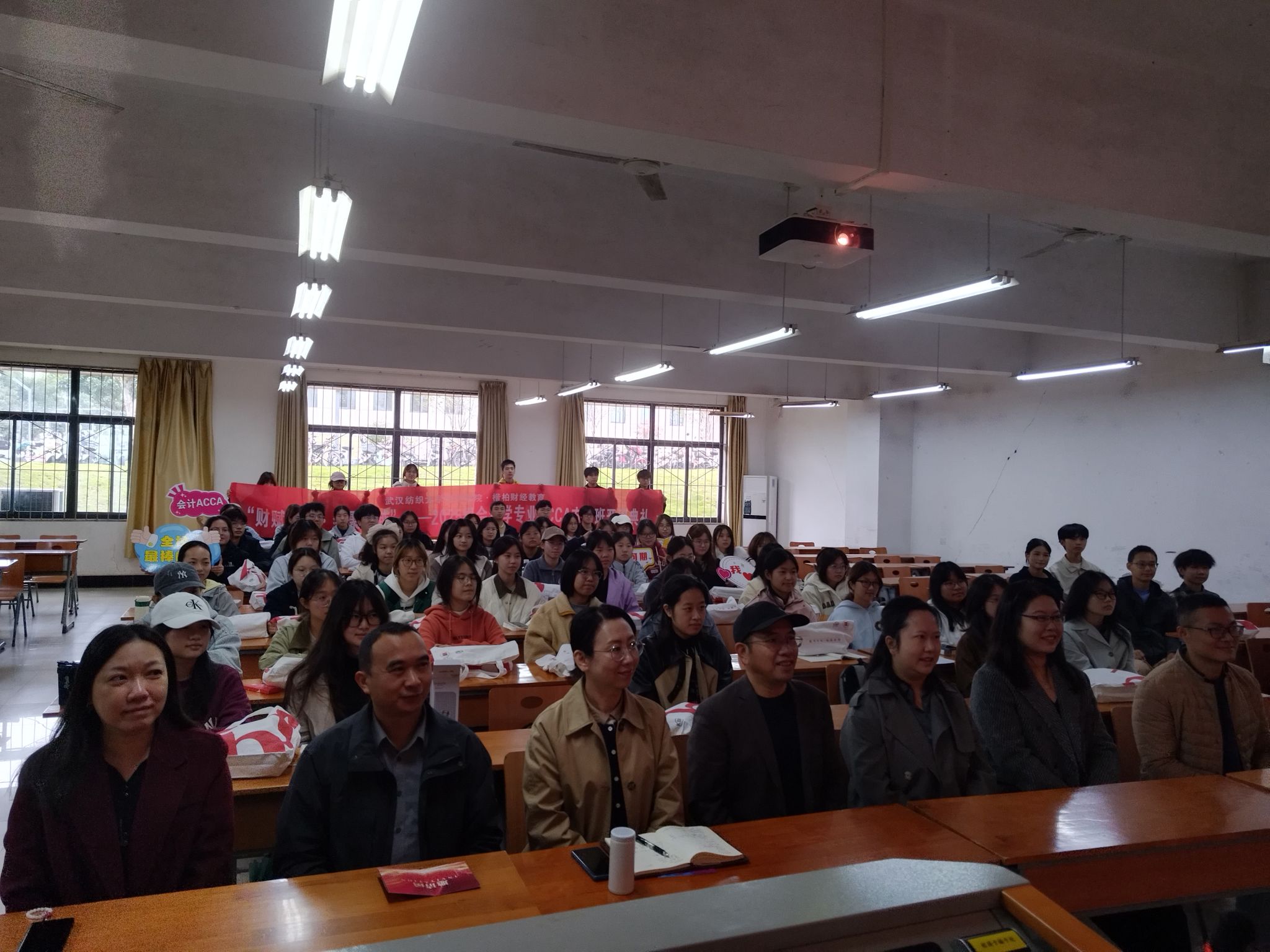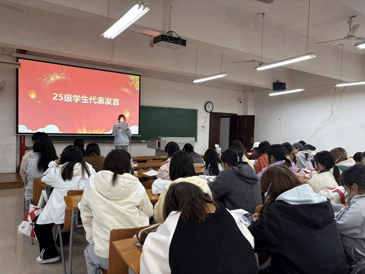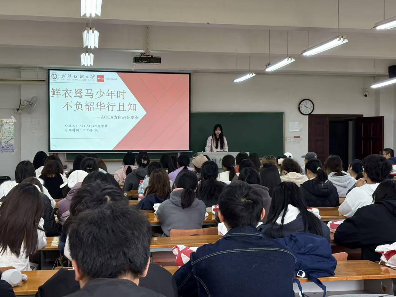 随后,2023级学姐邓雪晴分享主题:“鲜衣怒马少年时 不负韶华行且知”,从学习经验分享,到学科竞赛、社会实践、实习经历等方面娓娓道来,台下新生频频点头,不时举起手机拍照记录。2025级学生代表樊梓越则发出青春宣言:“我们要在全英文教学与全球统考的挑战中,练就过硬本领;在纺大ACCA大家庭里,保持初心、砥砺前行!”全班气氛瞬间点燃,掌声四起。