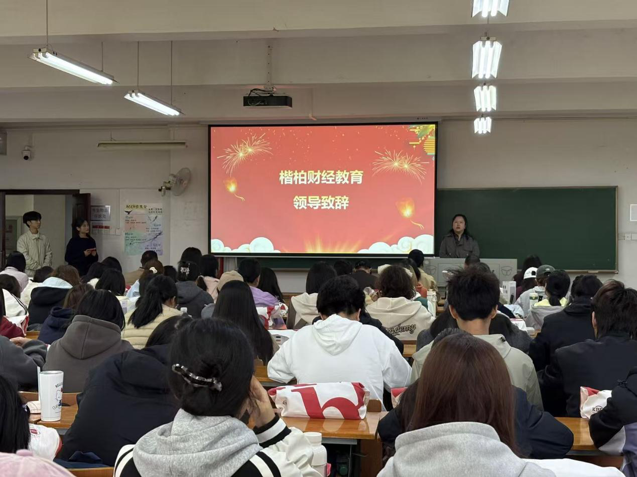 楷柏教育总经理康莎莎随后在致辞中回顾了自2012年共建ACCA方向班以来,已培养毕业生1000余人,现有在校生200余人。她指出,ACCA即将进行改革,课程内容将更紧贴数智时代发展,考试路径也将更加灵活。勉励同学们保持自律,紧跟学习节奏,特别是本学期BT《商业与技术》课程要紧跟老师进度。她表示,楷柏教育将继续与学院深度协同,助力学生通过“国际证书+名校学历+名企实践”的三重跳板,实现快速成长。