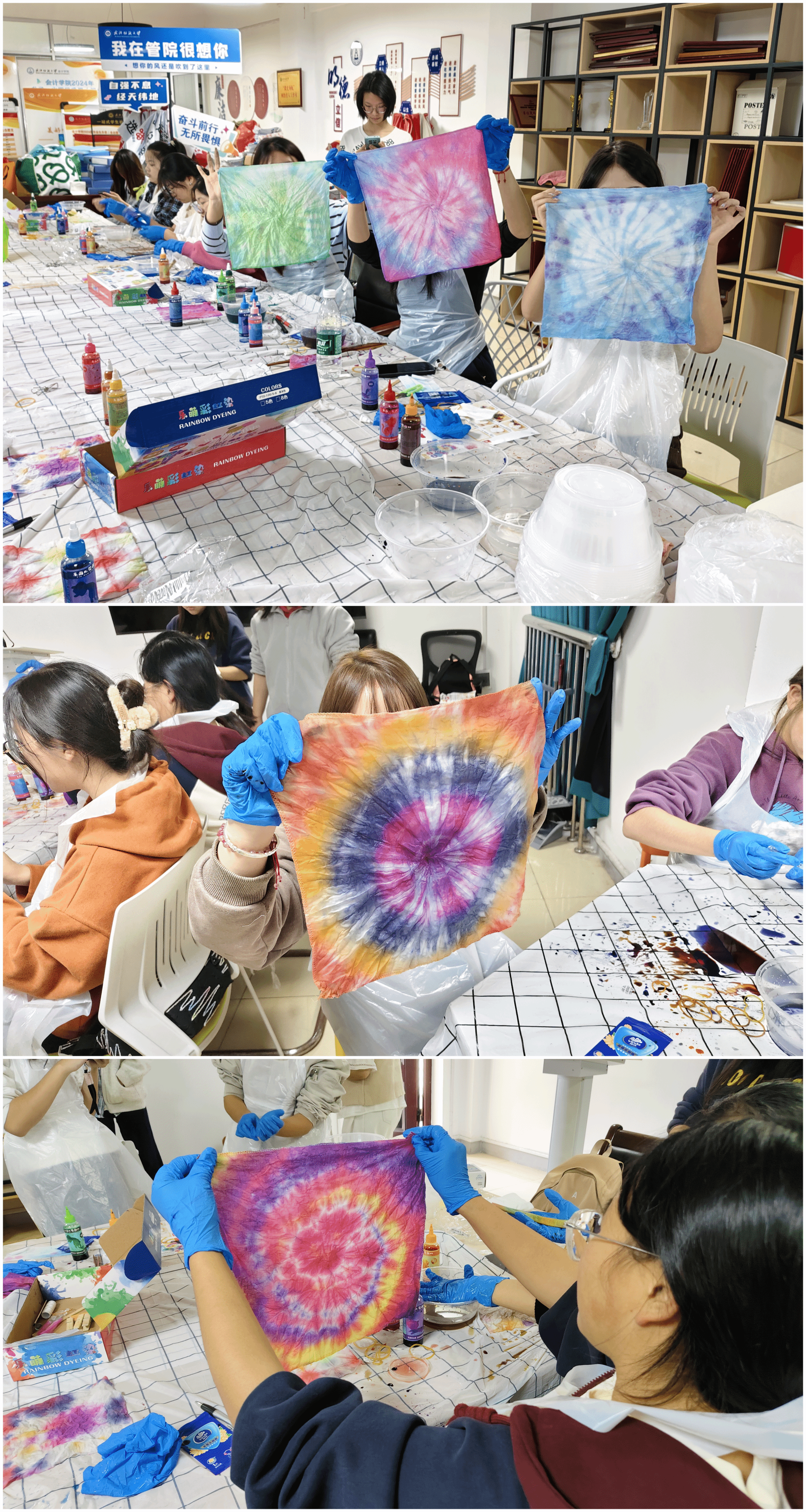 活动现场气氛热烈。活动伊始,负责人介绍了主题内容与流程安排,并重点强调了染料使用安全规范。在扎染体验环节,同学们充分发挥创意,自由组合设计、捆扎布料,亲手制作出各具特色的扎染作品。活动过程中,工作人员耐心指导、协助解答操作疑问,确保参与同学顺利体验手工创作乐趣。除动手实践外,活动还设置了“心灵信箱”环节。参与者匿名书写情绪小纸条并投入信箱,以轻松方式表达内心感受。在作品展示阶段,同学们积极分享创作思路与参与心情,交流在“创作—等待—揭晓”过程中获得的成长体验与情绪变化。
