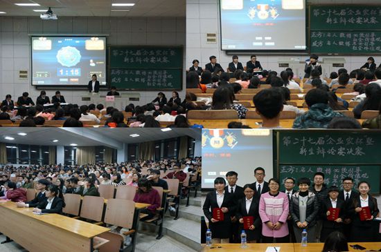 本次辩论赛便围绕“名人微博是否必须引导社会价值观”展开激烈辩论。赛制为攻辩赛制,首先是正反方一辩陈述己方观点。正方一辩余松霖说道:名人是在一定范围内具有高知名度并引人注意的人,能对社会发展产生重要的影响。反方二辩徐鑫则认为名人的能力参差不齐,判断标准不尽相同,这就使得名人引导会有不确定性。在第二个攻辩环节中,正方二辩朱灿与反方三辩张鸿毅分别抓住对方辩手的观点进行盘问,反方三辩提出“应该”与“必须”的区别,正方二辩强调了名人引导没有要达到一定高度,但须履行其责任与义务。精彩的辩论不时赢得在场观众的热烈掌声。攻辩小结里,正方一辩余松霖再次提出名人概念,指出名人既然获得了名人效应的光环,就应履行相应的义务。而反方一辩李玉洁则认为,法律规定每个人有言论自由权,名人也有自己的思想,他们的能力也有限,一味的强调名人微博引导社会价值观是一种道德绑架。自由辩论环节将比赛气氛再次推向高潮,双方辩手展开了激烈的唇枪舌战,辩手们逐条辩论,充分展示各方观点,精彩连连,观众的掌声不绝于耳。最后到了总结陈词环节,反方四辩王伟东总结了四点:第一,法律并没有明确规定名人微博必须引导社会价值观。第二,目前社会现状良好,不需要名人来引导。第三,名人能力有限,素质有别。第四,要求名人微博引导社会价值观是道德绑架的表现。正方四辩黄咏吉总结道,天下兴亡,匹夫有责。引导正确的社会价值观,有利于建成小康社会,有利于中华民族的伟大复兴。最后,经过评委和现场大众评委的评分,反方摘得本届新生杯辩论赛的桂冠,正方二辩朱灿获得最具风度辩手,反方二辩徐鑫获得最佳辩手。
