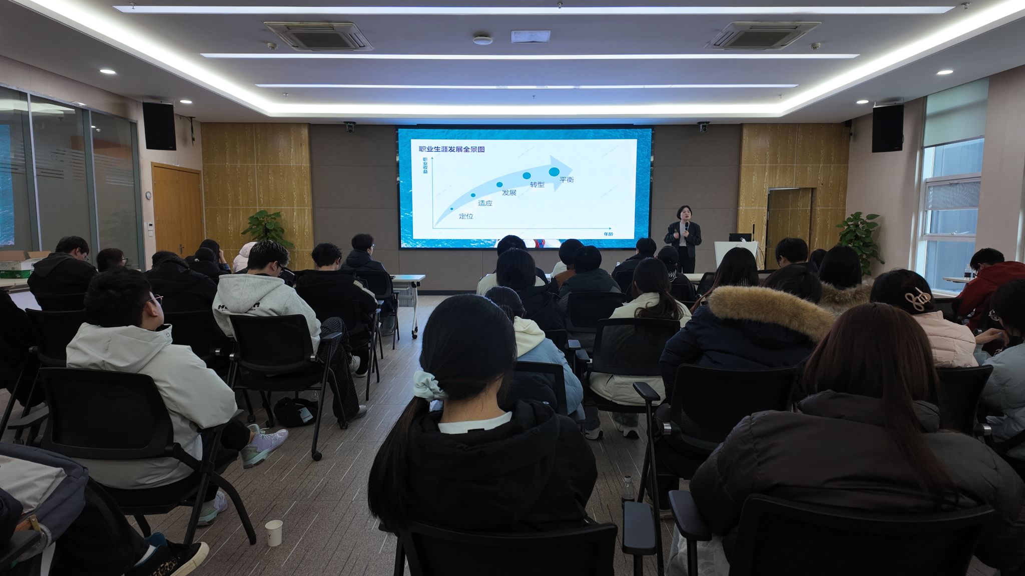 车间参观结束后,岚图邀请胡洁讲师以自身12年的职业经历为切入点来为我们讲解作为临近毕业的大学生应该如何规划自己的职业生涯,倡导本科阶段的学子在毕业前做好精准职业定位,主动挖掘自身优势与潜力。
