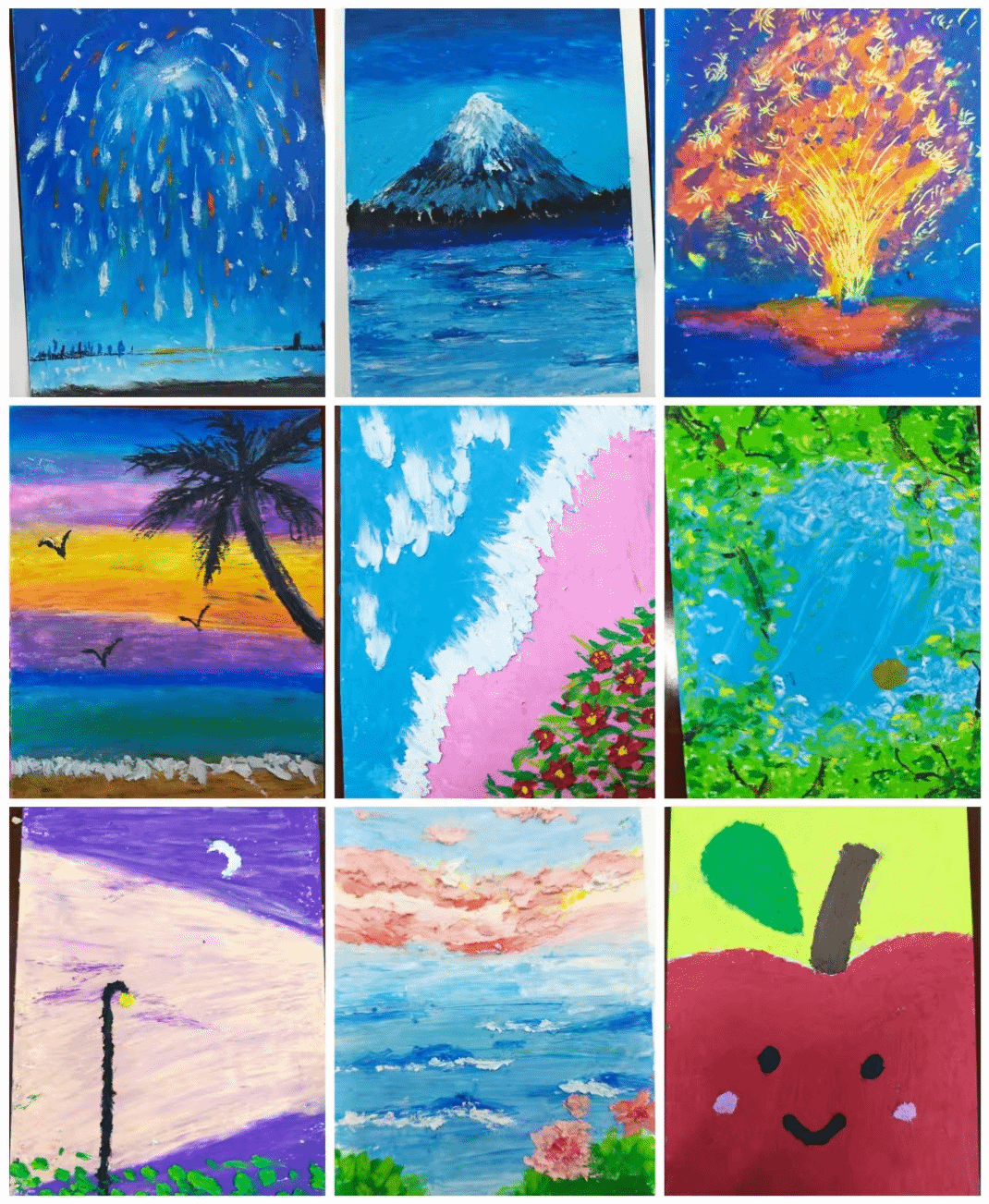 有的同学以橙蓝为主色调,精心雕琢出“黄昏大海边”的壮丽景色,远处的飞燕、鲜红的云彩,精致的椰树,每一处细节都饱含着对生活的美好期许;有的同学则巧用缤纷色彩拼贴出绚烂的烟花,鲜明的色彩搭配传递出直抵人心的治愈力量;还有同学发挥奇思妙想,塑造出夜晚路灯的寂寥风景,还有的只用红,绿黄等几种色调,勾画出一颗可爱的苹果。一幅幅充满想象与汗水的创意在白纸上渐渐成型,每一件作品都独一无二、充满个性。原本安静的会议室不时响起阵阵轻松的笑声,欢声笑语中,压力与疲惫悄然消散。