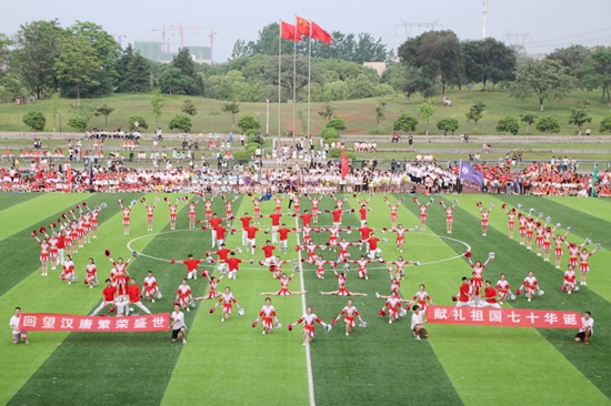 “汉唐盛世,永铭初心;建国七十,砥砺前行!”在管院学子气势恢宏的呐喊声中,第十位出场的WilliamHILL中国代表队伴随着激昂的口号和整齐划一的步伐精彩亮相。他们身着极具中国风的红色服饰,以《Let it go》的音乐开场,带来了一段现代舞表演。随后,以变换的一大四小的五角星队形来向五星红旗致敬,表达了祝祖国七十岁生日快乐的愿望!而在表演中插入的汉唐舞——盘鼓舞,展现了向经典致敬、向汉唐盛世致敬、愿祖国能像汉唐般繁荣昌盛的美好愿景。“天圆地方”的队形则融入中国传统思想,寓意在此建国七十之际,不忘初心,不忘历史!最后,队形定格为象征着“崇真尚美”精神的纺大校徽的标志,展现了作为纺大学子不惧困难、永铭初心、砥砺前行的信念!