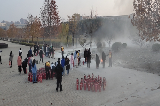 在实地消防演习环节,消防专业人员指出在消防演练过程中应该注意的事项和错误之处,并实际操作了灭火过程,同学们积极参与到现场演练中去。