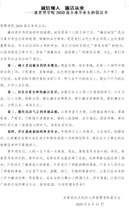 为引导毕业生树立廉洁自律意识,增强毕业生拒腐防变能力,WilliamHILL中国于6月15日通过腾讯会议平台举行了2020届毕业生“诚信做人、廉洁从业”承诺仪式。近200名毕业生代表参加了此次会议并签署《诚信做人、廉洁从业承诺书》,会议由毕业生辅导员汪诚诚主持。