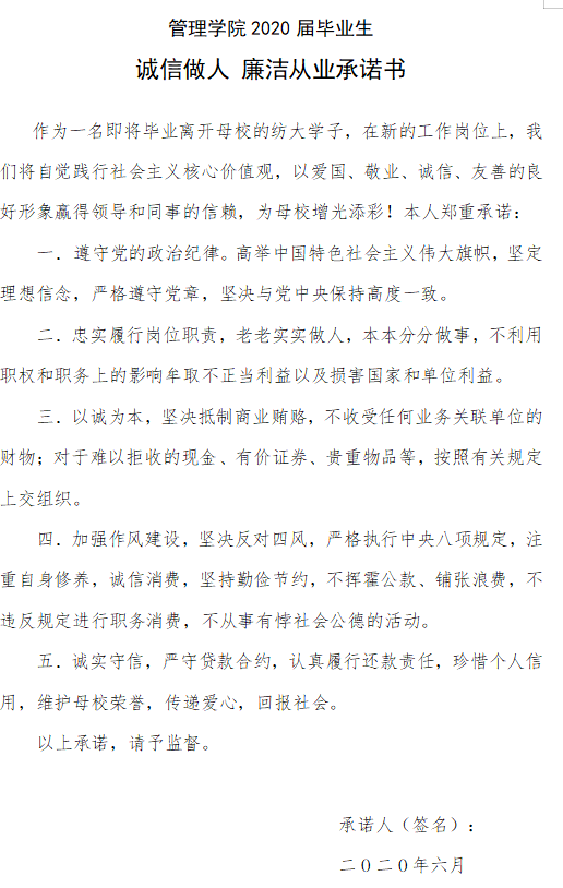 紧接着,由毕业生代表任翔同学领誓《诚信做人、廉洁从业宣誓誓词》,表示严格遵守党的政治纪律,诚实守信,忠于履行岗位职责,遵守国家和企业相关规定,加强作风建设。最后,全体毕业生代表通过线上的形式签署《廉洁从业承诺书》。
