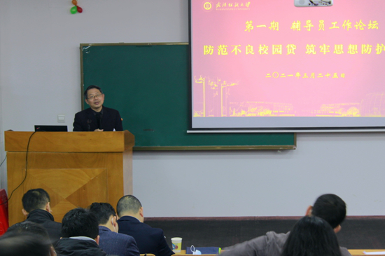 3月25日上午,学校第一期辅导员工作论坛在崇德楼T301举办。本次论坛以“防范不良校园贷筑牢思想防护网”为主题,围绕进一步做好校园金融风险的防范化解,扎实推进“不良校园贷”防范处置工作,增强学生风险意识和责任意识等方面进行交流研讨。校党委常委、副校长唐敏出席本次论坛,学工部和保卫处负责人,各学院分管学生工作负责人及全体辅导员参加了本次论坛。武汉市公安局文保局的部分一线警官到场交流。