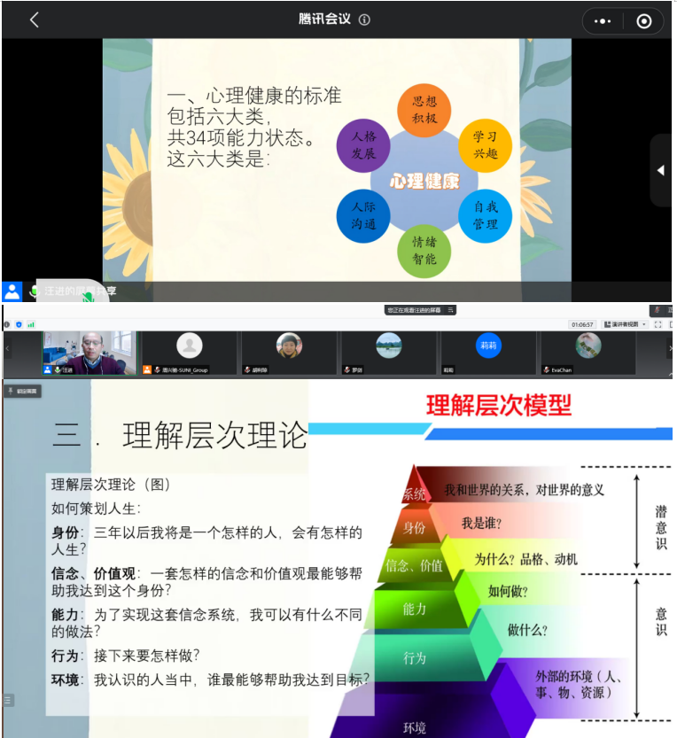 讲座开始前,周兴驰老师简单介绍了此次主讲老师,汪进老师是高级心理咨询师、高级家庭教育指导师、武汉大学人民医院精神科特聘心理专家、武汉生命之树心理咨询有限公司创办人,总督导、williamhill官网SUNI智慧校招创业团队专家顾问。随后,汪进老师以《认识自己,做情绪的主人》为题,主要从心理健康的标准、信念系统、理解层次理论、自我意象以及情绪智能等5个方面展开阐述。汪进老师从思想、学习等角度展开,让同学们深切体会自身心理健康程度,以及改正方法。根据理解层次理论理解自我,对人生进行策划。他谈到“一个人所有的行为、情绪、举止甚至才能,永远与自我意象相一致”的观点。阐述情绪对人的重要性,让同学们认识自身情绪并且学会如何管理自身情绪。