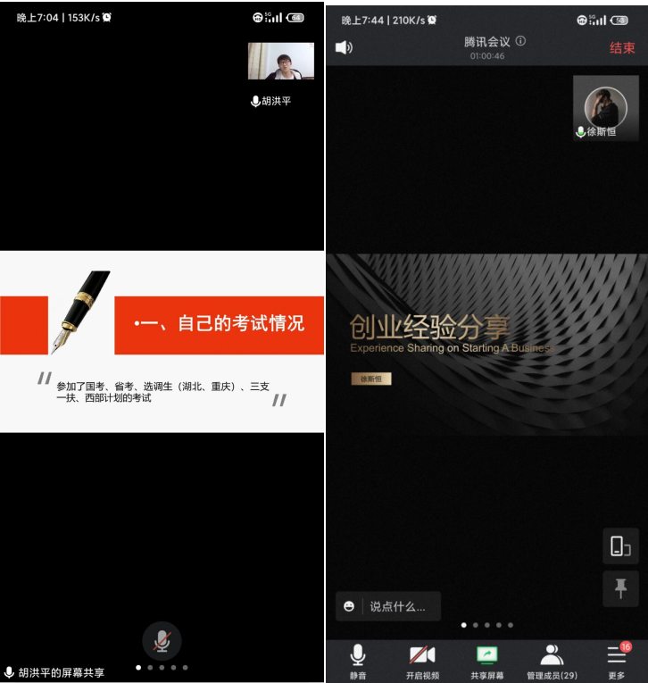 胡洪平,21届优秀毕业生、西部计划服务者,现在恩施市人民政府舞阳坝街道通办事处工作;徐斯恒21届优秀毕业生、优秀创业者,咸宁金腾机动车检测有限公司法定代表人。