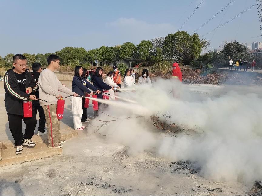 “握住软管前端,站在上风方对准火焰根部进行喷射。”保卫处工作人员详细讲解示范了灭火器的使用方法和操作流程。同学们兴趣高涨,踊跃参与到体验活动中来,在工作人员指挥下纷纷上前亲身体验灭火的过程。