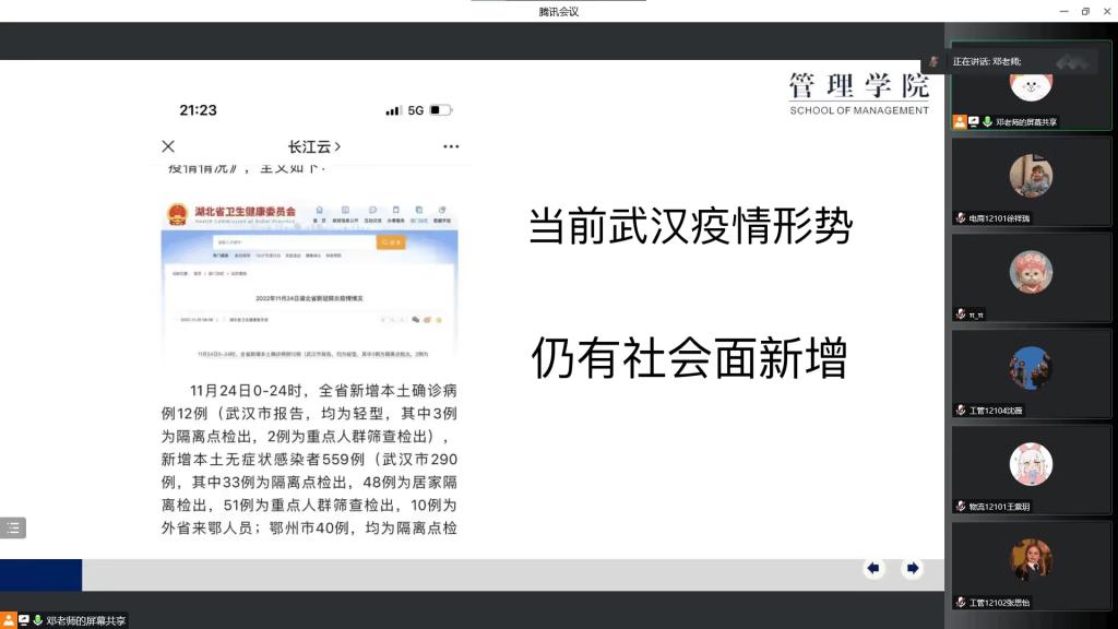 会议伊始,邓兰向同学们讲明目前疫情防控形势,近期湖北省多地市相继出现确诊病例,疫情防控形势再次严峻。希望同学们自觉支持校园防疫工作,做好自身健康状况监测,坚持“一日三测”体温。出现身体不适等状况,要按照学校疫情防控流程第一时间上报老师。同时,同学们要自觉配合好学校组织的每日全员核酸检测,确保应检尽检,不漏一人,检测过程一切行动听从指挥,佩戴好口罩,保持一米以上间隔距离。随后,邓兰提醒同学们保持良好的生活卫生习惯,勤洗手,宿舍常通风并及时进行消杀通风工作;保持合理作息,适当运动;减少网购,接收快递需要消毒。许清纯提醒同学们临近期末考试,要注意认真复习、劳逸结合,做到诚信应考。