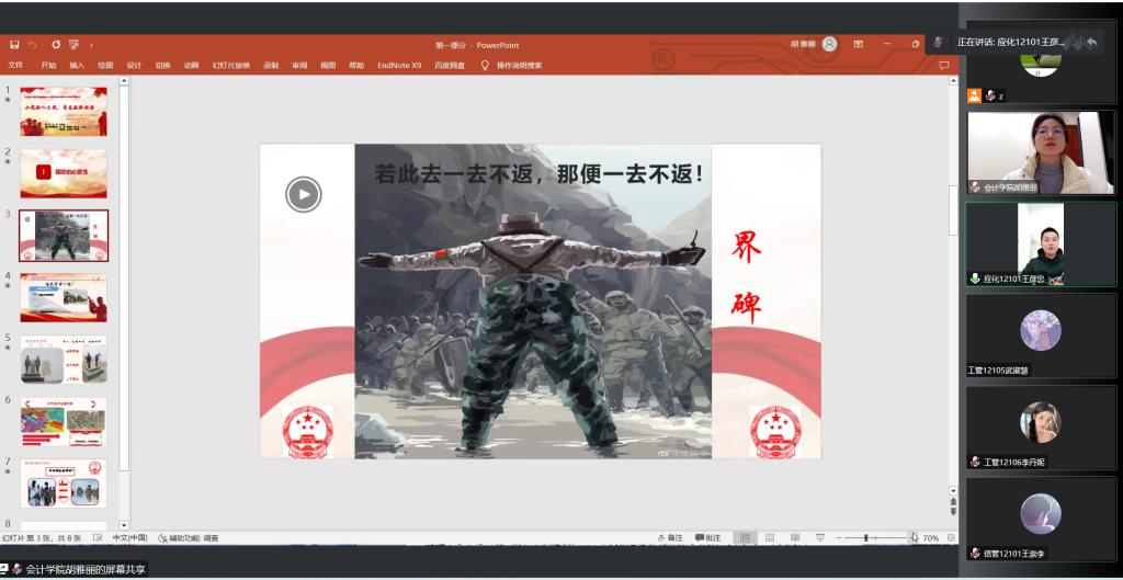 最后,周成杰同学以“以无悔之青春、护卫盛世之中华”为题,为同学们讲述了他的入伍经历。周成杰同学从自身出发,分享了自己的入伍初心,在部队的所见所闻,通过照片的形式描述了部队的日常生活和训练剪影,然后又向大家讲述自己退伍后的所得所感,部队经历带来的意志品格、军人气质等方面的感悟。同时周成杰认为当代大学生增强国防力量,可以从思想和行动上两个层面上努力,思想上增强坚定思想引领、学习军事理论、关心国际形势;行动上积极参军入伍、练就强健体魄、提高专业能力,强调大学生群体对于国防的重要性,呼吁我们青年一代,当肩负起家国责任,希望同学们能够积极为国防事业贡献自己的一份力量。