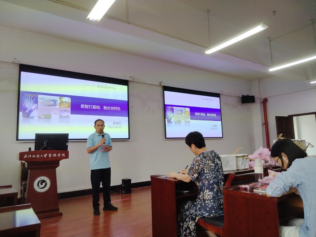 学院党委书记滕胜娟传达了学校学习贯彻习近平新时代中国特色社会主义思想主题教育推进会精神,并就学院落实主题教育系列活动开展情况进行总结与下一步部署。院长吴金红以“数智打基础,融合创特色”为题讲授专题党课,他回顾了习近平新时代中国特色社会主义思想的主要内容,并结合学校近期新一轮本科教育教学审核评估、主题教育、科技创新大会动态,对学院本学期本科、研究生教育教学、学科建设等工作重点进行了总结,针对学院发展过程中的主要问题,提出要以习近平新时代中国特色社会主义思想为指导,紧扣“四个面向”,以国家战略需求和跨学科重大问题为导向,集聚力量开展“管工艺”学科交叉融合的原创性引领性科研攻关,服务地方经济发展。