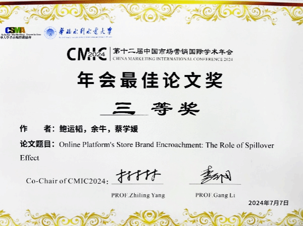 值得一提的是,在导师余牛教授和蔡学媛副教授的共同指导下,来自我院“时尚供应链与智慧物流研究中心”研究生鲍运韬汇报的论文《Online Platform’s Store Brand Encroachment:The Role of Spillover Effect》表现突出,得到了宾夕法尼亚大学沃顿商学院张忠教授和上海外国语大学樊骅教授的充分肯定,并在最终激烈的论文评选中获得本次CMIC 2024年会最佳论文三等奖(本次线上+线上分论坛的汇报论文数量总计350篇,共评选出了10篇优秀获奖论文)。