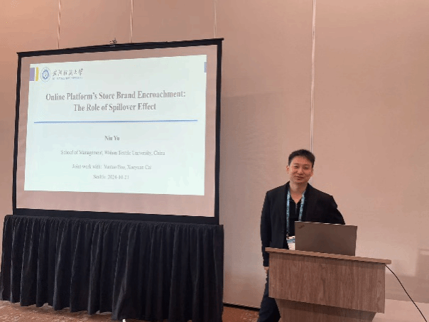 我院物流管理系余牛教授和梅启煌博士应邀参加此次盛会,并在分论坛上分享了相关研究成果,其中余牛教授汇报了题为“Online Platform’s Store Brand Encroachment: The Role of Spillover Effect”的工作论文,深入探讨了溢出效应下在线平台的品牌入侵问题。梅启煌博士的报告题目为“Assortment Planning and Order Allocation with Order Splitting”,聚焦于仓库管理中的SKU选品和订单分配问题。两位老师的报告得到了多位学者和同行的关注与肯定,并在会场进行了热烈的讨论。