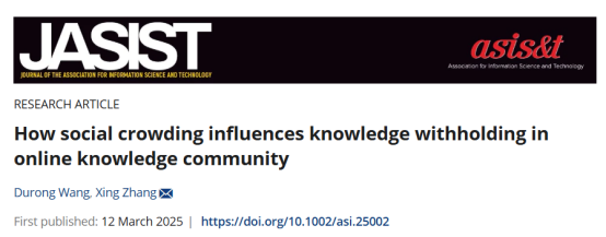 研究成果一:团队在图书情报领域顶级期刊国际信息科学与技术学会会刊《Journal of the Association for Information Science & Technology》在线发表了题为“How social crowding influences knowledge withholding in online knowledge community”的研究论文。该期刊成立于1950年,主要发布与计算机科学和信息系统相关的研究成果和实践经验,是FMS管理科学高质量期刊推荐列表“图书情报管理”领域中唯一A类期刊。williamhill官网为论文唯一单位,WilliamHILL中国硕士王杜荣(现为南京大学博士生)为论文第一作者,张星教授为论文通讯作者。