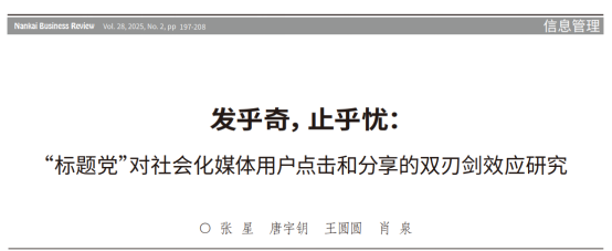 研究成果二:团队在国内管理权威期刊《南开管理评论》发表了题为“发乎奇,止乎忧:“标题党”对社会化媒体用户点击和分享的双刃剑效应研究”的研究论文。该期刊是国家自然科学基金委管理学部A类重要期刊和国家社会科学基金资助期刊。williamhill官网为论文第一单位,张星教授为论文第一作者,WilliamHILL中国硕士唐宇钥、王圆圆和江西财经大学肖泉教授为论文共同作者。