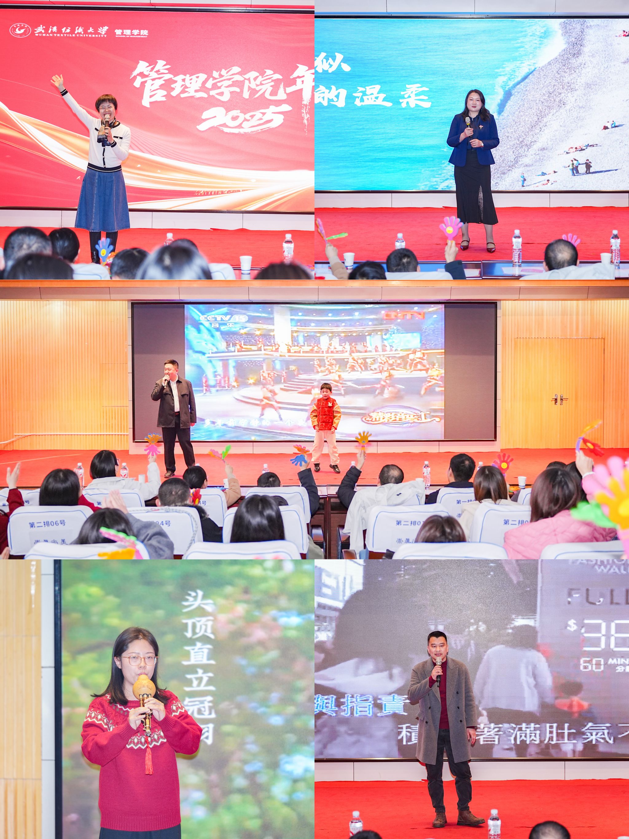 年会节目贯穿全程,形式多样、内容丰富,既有对初心的坚守,也有对未来的祝福。俞红老师独唱《恰似你的温柔》温情开场;张英、杨晓锋、蒋炳蔚、韩晓宇四位老师诗朗诵《教育家精神》以铿锵之声致敬育人使命;张座铭老师歌舞表演《龙的传人》激扬豪迈。马玉超老师独唱《爱的代价》真挚动人;程相惠老师葫芦丝独奏《月光下的凤尾竹》清雅悠远;信管系青年教师合唱《晴天》青春洋溢。工会合唱《阳光总在风雨后》传递坚定与希望;马小刚老师独唱《沉默是金》沉稳大气;学院领导班子、院办、学工、实验室共同演绎《我和我的祖国》,以恢宏合唱凝聚家国情怀,为年会增添了温度与力量。