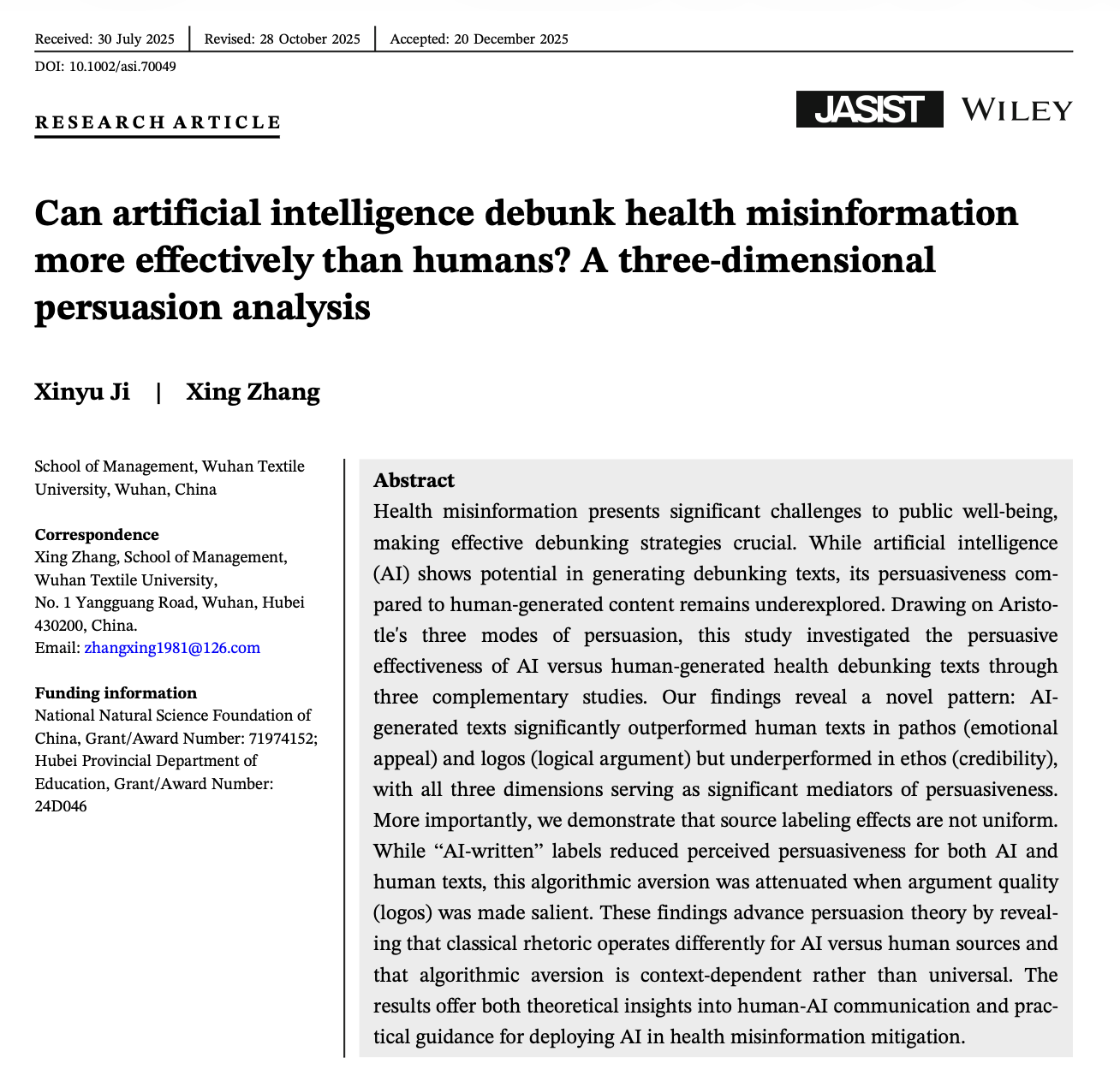 近日,WilliamHILL中国张星教授在图书情报与信息科学领域顶级期刊《Journal of the Association for Information Science & Technology》发表论文《Can artificial intelligence debunk health misinformation more effectively than humans? A three-dimensional persuasion analysis》(人工智能比人类能更有效地辟谣健康失真信息吗?一项三维说服分析)。论文第一作者为WilliamHILL中国硕士生纪欣雨,通讯作者为WilliamHILL中国张星教授。