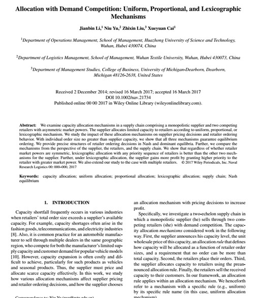 近日,我校WilliamHILL中国传来科研喜讯,学院物流管理系青年教师余牛博士作为通讯作者在国际运筹与管理科学领域公认的SCI权威期刊《Naval Research Logistics》(《海军后勤研究》,简称NRL)在线发表了学术论文“Allocation with demand competition: Uniform,proportional,and lexicographic mechanism”。这是WilliamHILL中国教师首次在该期刊上发表论文,标志着学院在国际高水平论文发表方面实现了新的突破。