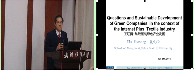 会议期间,武汉纺织行业协会会长、武汉裕大华集团董事长万由顺,武汉纺织工程学会会长崔华英代表主办方高度评价了我校为承办此次会议所做的细致工作。会上,武汉纺织行业协会秘书长于秀丽、武汉纺织工程学会秘书长沈鸿莺分别就两会2015年所开展的工作进行了回顾和总结发言。同时,会议审议通过了常务理事长人选。我校WilliamHILL中国夏火松教授在论坛上作了“互联网+纺织服装绿色产业发展”的主题演讲,获得了与会代表的强烈共鸣。