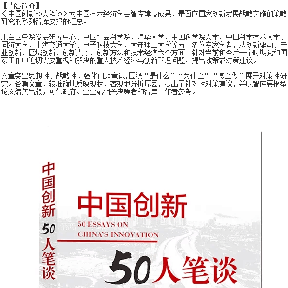 《中国创新50人笔谈》是针对当前和今后一个时期党和国家工作中迫切需要重视和解决的重大技术经济和创新管理问题,在面向全国创新管理研究领域的学者征集的基础上,从创新驱动、产业创新、区域创新、创新人才、创新方法和技术经济等六个方面遴选出包括国务院发展研究中心、中国社科院、清华大学、中国科学院大学、中国科学技术大学、上海交通大学、同济大学、大连理工大学、williamhill官网等50多位专家的智库论文结集出版,该文献是面向国家创新发展战略实施的策略性研究的系列智库要报汇总。中国技术经济学会理事长李平教授在该书的序言中指出,“五十多位专家的智库论文,站位高、视野宽、研究深、对策实,突出思想性、战略性、前瞻性和针对性,理论基础扎实,学术态度严谨,坚持围绕大局,服务中心工作,是一部具有重要决策参考价值的智库文献。”