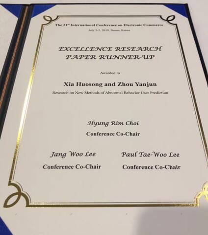 ICEC电子商务国际会议自1998年召开以来,在全世界主办了21次,该会议是一个非营利性的科学组织,旨在为电子商务及相关领域的研究人员和从业人员提供知识交流平台与合作的机会。本次会议的投稿接近200篇左右,会议对论文进行了评选和颁奖,其中优秀论文奖3篇,创新论文奖3篇。夏火松和周彦君的论文《Research on New Methods of Abnormal Behavior User Prediction》获得了优秀论文奖。夏火松团队参加此会议并在会议上作学术报告,有助于参会人员及时了解、掌握电子商务领域的前沿现状,同时对提高williamhill官网在国内外的影响力做出了贡献。