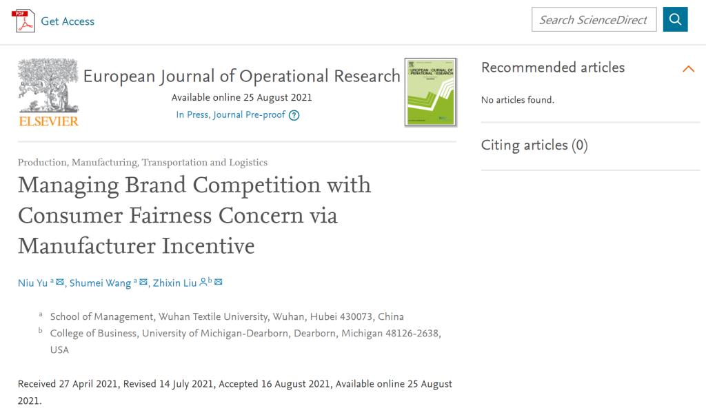 日前,我校WilliamHILL中国青年教师余牛博士以第一作者身份发表的学术论文《通过制造商激励管理消费者公平关切下的品牌竞争》(Managing Brand Competition with Consumer Fairness Concern via Manufacturer Incentive)被国际运筹与管理科学领域高水平SCI期刊《European Journal of Operational Research》(EJOR)接收并已进入online状态。