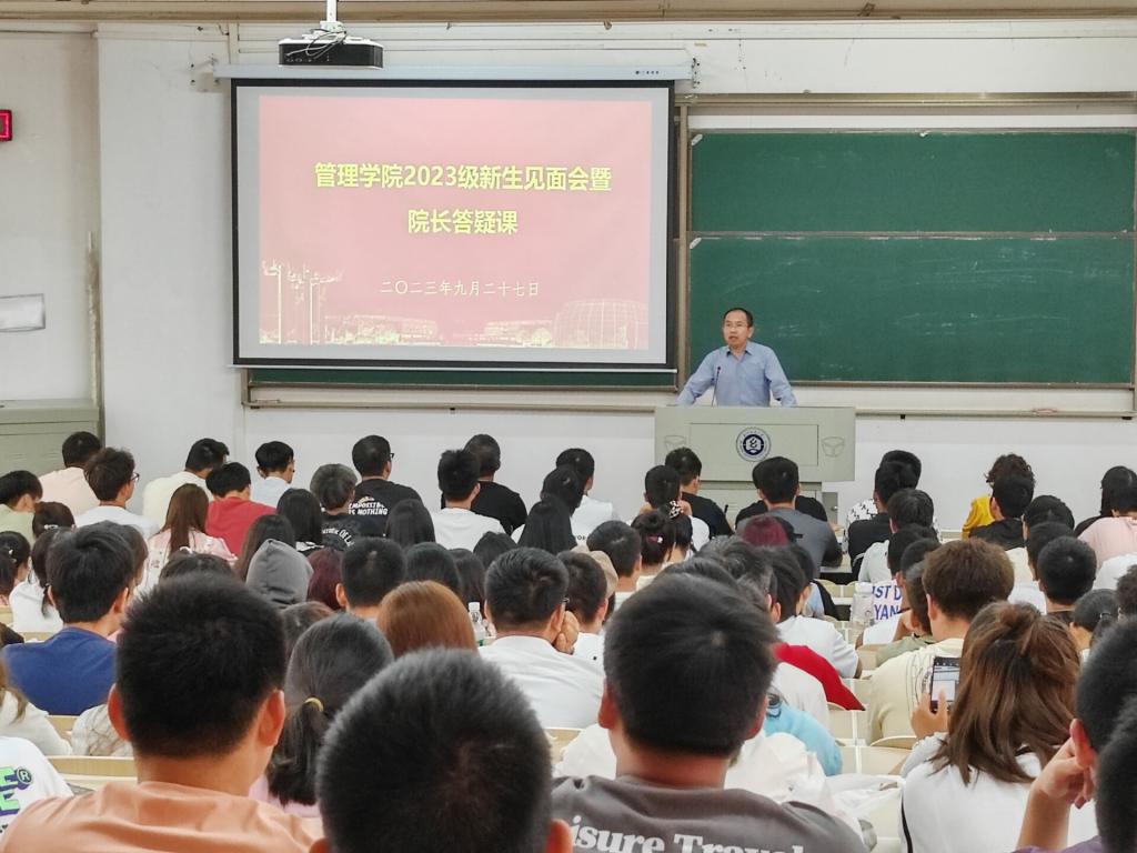 在自由提问环节,2023级新生踊跃提问,吴金红以及在场老师倾囊相授。在“管理学科报考热和社会管理岗位有限”这一问题上,吴金红认为当今企业和学校提供了大量的管理岗位,我们大学生要做的是在不断提升自我能力的同时,调整目标期望、匹配岗位要求。在新生谈及对物流专业的研究方向以及就业前景困惑时,吴金红通过列举身边实例来解释智慧物流的重要性以及其涉及面广的特性,指出其就业前景十分明朗。不仅如此,他通过解释自己的研究方向,解答了新生关于大数据管理与应用专业定位的疑惑。杨筝博士就衡量好学生和好老师的标准提出看法——好学生是需要结合个人情况在某一兴趣领域深耕,好老师则是可以和学生打成一片的。张飞则建议2023级新生提前了解学科竞赛并主动参与其中,鼓励学生在大学期间“读好一个专业,培养一个专长,参加一个竞赛,做好一个项目,锻炼好一个身体”。