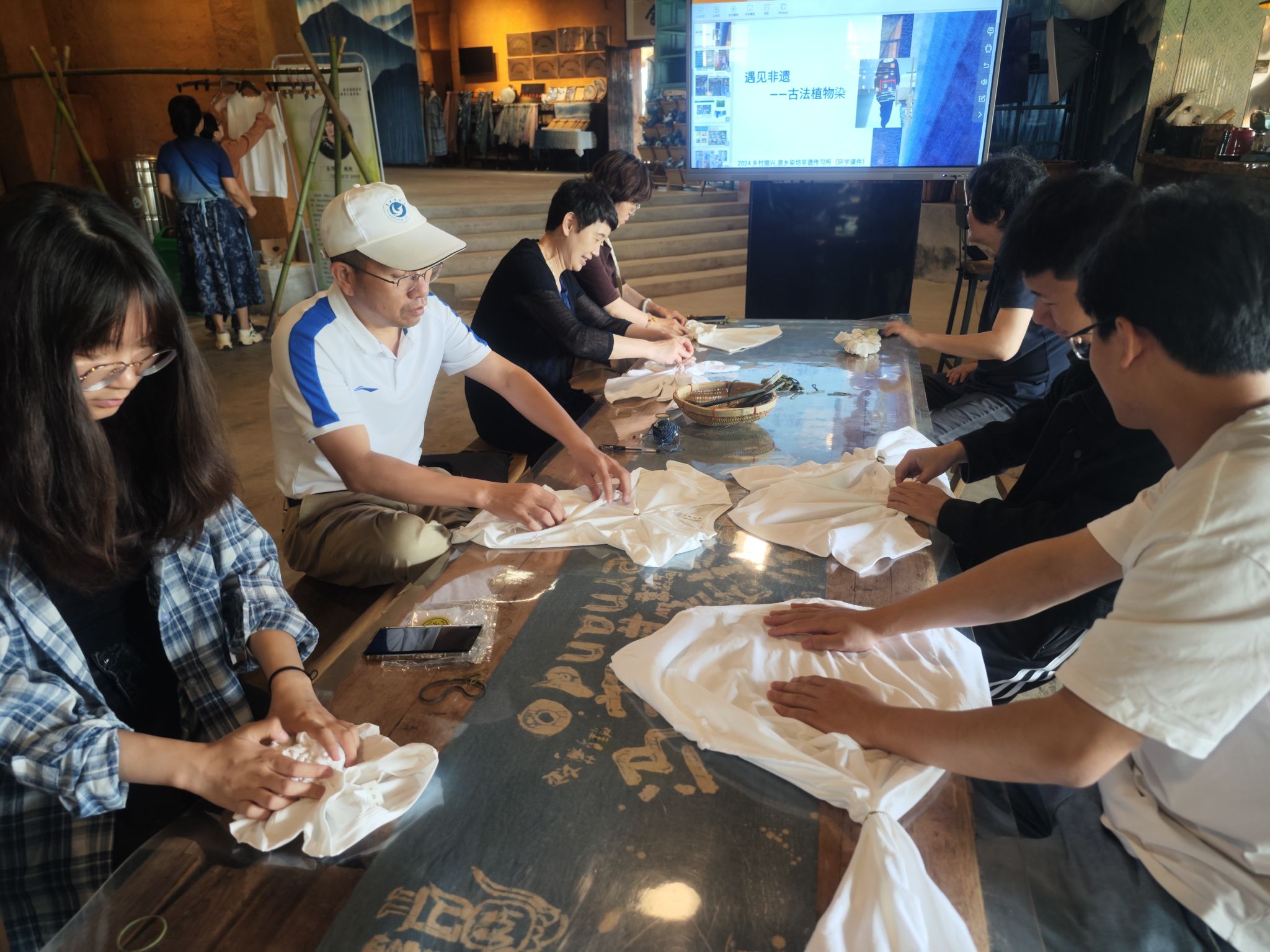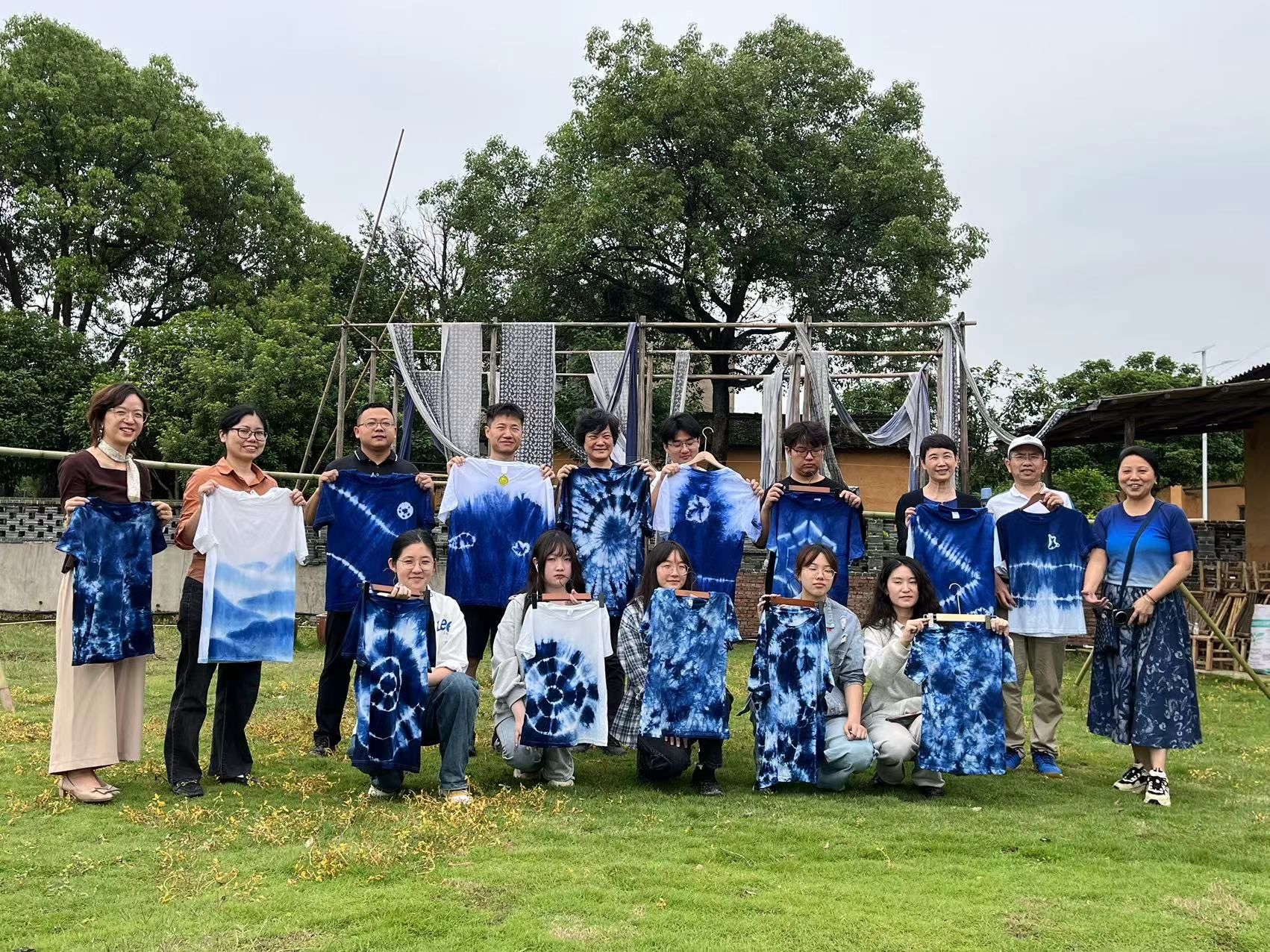 卓然村是一个拥有300多年织染文化的历史村落,依然保留着清晰可传的手工纺纱织布技艺。原乡染坊于2017年在卓然村创办,融入卓然村文化,一直专注于手工织布与天然古法植物染技艺的传承与发扬,已经成为浏阳市示范性非遗传习所。一行人参观了原乡染坊,深入了解了非遗文化的传承和发展,亲身接触到手工织布和古法印染。在交流会上,双方就原乡染坊的品牌建设、运营、推广等方面进行了研讨,我院针对其中存在的一些问题提出了建设性意见。随后,成员们学习了植物染的扎染技术,并亲自动手进行了实践,染出了一件件独特的衣服,在实践中感受到古法植物染的魅力。