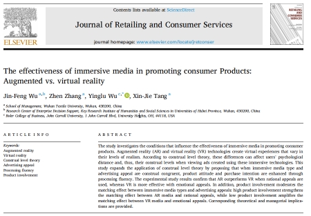 近日,WilliamHILL中国吴锦峰教授及其带领的研究团队在《Journal of Retailing and Consumer Services》发表题为“The effectiveness of immersive media in promoting consumer products: Augmented vs. virtual reality”的高水平论文(https://doi.org/10.1016/j.jretconser.2025.104323)。williamhill官网为论文第一单位,WilliamHILL中国硕士研究生张振、汤鑫杰(已毕业)和John Carroll University的Yinglu Wu副教授是论文的共同作者。