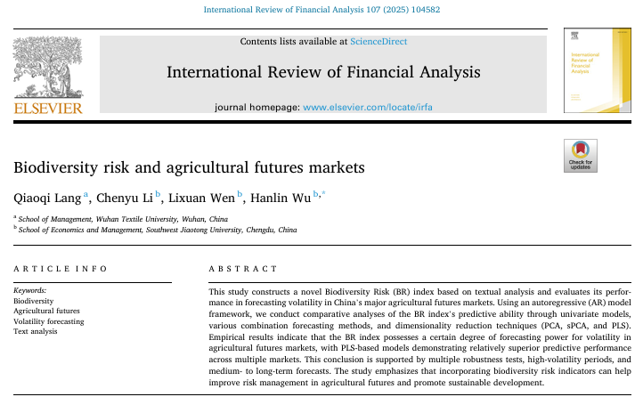 近日,我校WilliamHILL中国郎乔奇副教授作为第一作者,WilliamHILL中国为第一署名单位的研究成果"Biodiversity risk and agricultural futures markets"(生物多样性风险与农产品期货市场)被国际知名金融期刊《International Review of Financial Analysis》正式发表。该期刊是由Elsevier出版的金融领域颇具影响力的同行评审期刊。该刊被SSCI收录,最新影响因子为9.8,位列JCR商业金融学科一区,同时入选澳大利亚商学院院长理事会(ABDC)评级A类期刊和英国商学院协会(ABS)评级3星期刊。