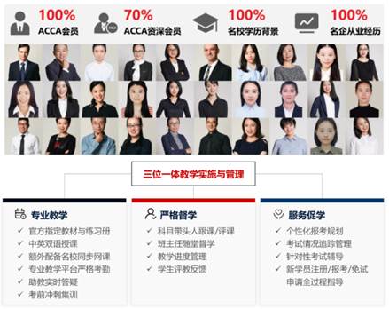 本专业ACCA科目的授课师资均为名企从业经验丰富的ACCA持证人,部分还是全球统考命题人和评卷人;教学采用英文原版教材和练习册,中英双语授课,并额外配备专职班主任与助教老师,学习全过程辅导,及时扫除知识盲点;免费配备与众多双一流高校同步使用的ACCA网络课程,帮助同学们高效学习与备考。