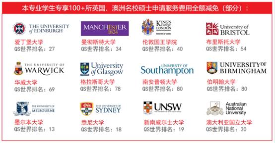 本专业学生还能专享包括曼彻斯特大学、爱丁堡大学在内的英国名校和悉尼大学、墨尔本大学在内的澳洲名校等100+所大学个性化留学方案免费制定,并提供全球名校定制申请服务支持,轻松实现名校留学梦想。