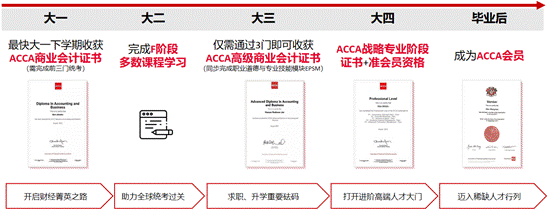 会计学专业(ACCA方向)科学安排大学四年ACCA课程学习与考试进度,学生可稳步提升专业技能水平,收获全球名企、名校认可的ACCA各阶段职业资格证书,就业、升学更具优势。
