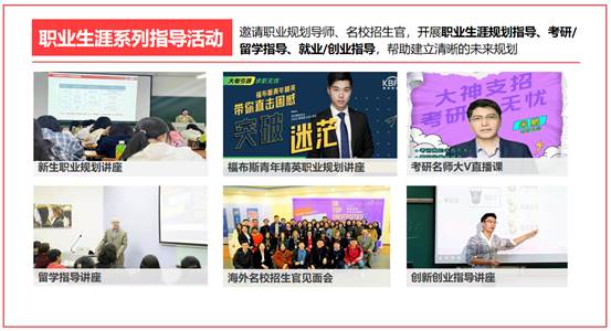 邀请职业规划导师、名校招生官,开展职业生涯规划指导、考研/留学指导、就业/创业指导,帮助建立清晰的未来规划。