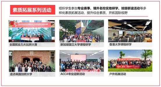 本专业注重理论与实践相结合的培养方式,大学四年全程贯穿丰富多彩的多元能力拓展与实践活动,包括职业生涯规划与指导、就业力提升、素质拓展等系列,为同学们提供专属成长平台,积累商业精英人脉,练就领导力、求职技能等多元化软性实力,全面提升个人综合素质。