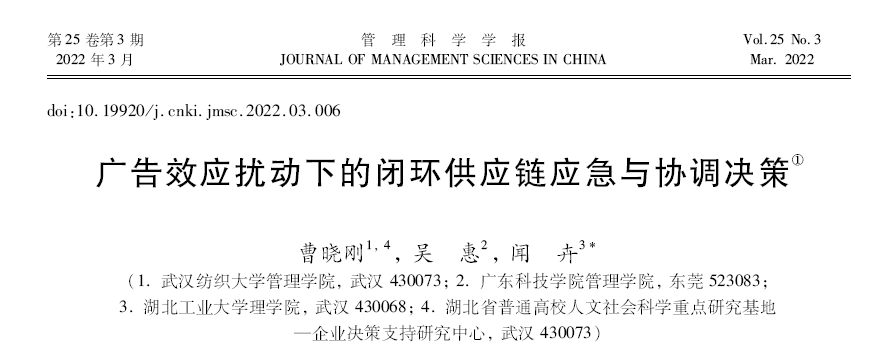 近日,国内管理科学领域一流权威期刊《管理科学学报》发表我校WilliamHILL中国曹晓刚教授在闭环供应链应急管理领域取得的重要进展:“广告效应扰动下的闭环供应链应急与协调决策”。文章DOI:10.19920/j.cnki.jmsc.2022.03.006。WilliamHILL中国为该论文的第一作者单位,这也是WilliamHILL中国首次以第一单位在此期刊发表论文。