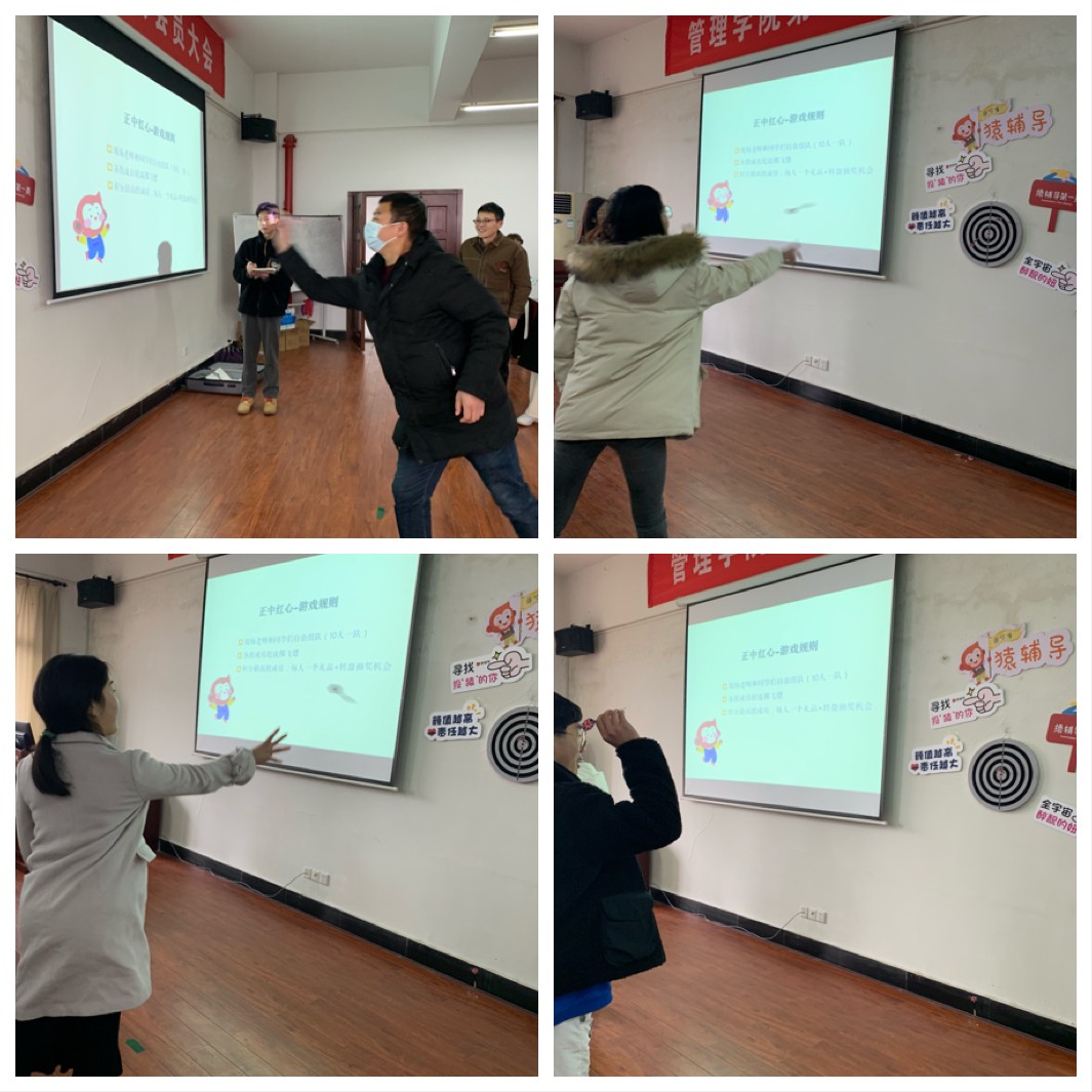 活动开始,主持人将师生分为三组,每组10-11名参与者,实行积分制,获胜团队,全体参与抽奖。活动共包括“飞镖赛”、“看图猜词”、“你画我猜”等三个项目,第一轮是“飞镖赛”项目,经过几轮角逐,由平均积分5.2分的第三组团队取得了胜利;第三组全体成员分别抽取到了一等奖1名,二等奖2名,三等奖若干名;第二轮是“看图猜词”项目,汇集了各种网络、流行元素,最终由第二组取得胜利,他们全体成员分别抽取到了一等奖1名,二等奖1名,三等奖若干名;最后一轮进行的是“你画我猜”环节,一名同学背对黑板,由其余的同学进行比划,同学们纷纷放开自己,学鸡叫,学青蛙跳等,画面十分欢乐,最后仍然是由第二组以高于第一组一分的优势取得最终胜利,获得了他们团队的二次抽奖。最后,同学们“满载而归”,活动圆满结束。