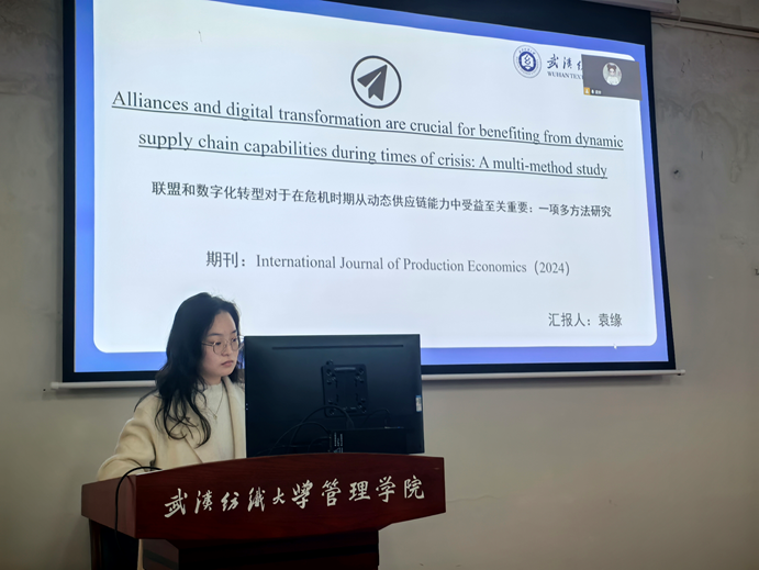 然后通过23级陈采怡介绍的论文《Manufacturer encroachment with an e-commerce division》,我们了解到了制造商通过电子商务部门直接销售的行为,集成式结构在直销成本较低时可实现多方共赢;23级王思思分享论文《企业数字化与绿色创新的关系:一个中介调节模型》,探讨了企业数字化水平对绿色创新的影响,鼓励企业绿色创新;最后,由23级袁缘介绍了论文《联盟和数字化转型对于在危机时期从动态供应链能力中获益至关重要:一项多方法研究》,研究了数字化转型和联盟管理能力在危机时期对供应链能力的影响,发现将两者结合可显著增强供应链能力,提升组织绩效。