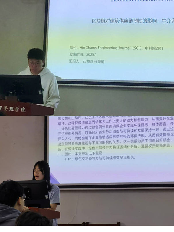 分会场7-513侯豪情同学以《区块链对建筑供应链韧性的影响:中介调节模型》为题,聚焦全球化背景下建筑供应链韧性(CSCR)提升路径。针对传统供应链存在的信息不对称与信任危机问题,研究提出区块链技术可通过增强透明度与协调性破解困局,并通过构建中介调节模型揭示供应链整合与环境不确定性的调节机制。张越同学在《绿色双元领导力与绿色供应链整合对可持续绩效的影响研究》中,结合高层梯队理论与资源基础理论,实证解析了绿色双元领导力的平衡互补机制。