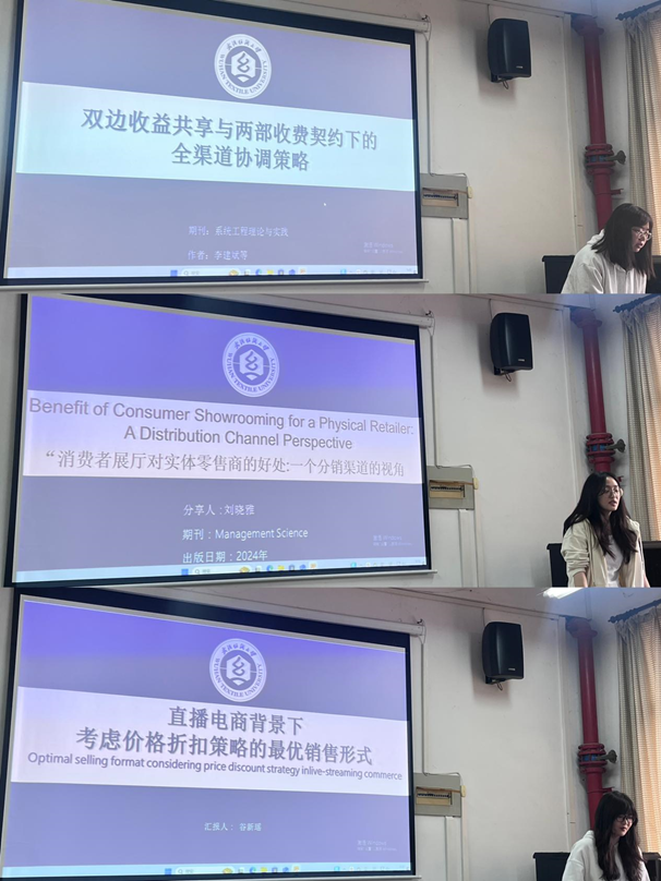 分会场7-536教室,首先洪子涵同学以《双边收益共享与两部收费契约下的全渠道协调策略》为题,通过构建博弈模型分析了线上线下渠道的利益分配矛盾,提出“动态契约+数据共享”的双轨协调机制,为全渠道供应链效率提升提供新思路。随后,刘晓雅同学汇报了论文《Benefit of Consumer Showrooming for a Physical Retailer: A Distribution Channel Perspective》,通过实证研究发现,消费者“展厅行为”虽导致短期销售分流,但能显著提升实体店的品牌认知与长期客户黏性。谷新瑶同学带来了《Optimal selling format considering price discount strategy in live-streaming commerce》的论文分享,结合动态定价模型与消费者心理阈值,揭示了“限时折扣+互动引流”组合策略对成交效率的显著影响。
