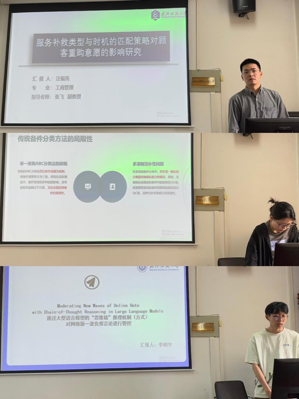 分会场7-536教室,汪福亮同学首先分享了《服务补救类型与时机的匹配策略对顾客重购意愿的影响研究》,通过情景实验验证了补救时机和类型的匹配效应。之后由宋琬婷同学介绍了《基于改进聚类和神经网络的多准则备件分类》,提出了一种改进的备件分类模型。李翱宇同学分享的论文《Moderating New Waves of Online Hate with Chain-of-Thought Reasoning in Large Language Models》,提出了一个基于思想链推理的框架来缓解网络仇恨。