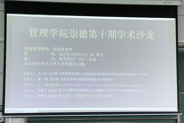 卢璇同学分享的论文《Last mile delivery routing problem with some-day option》,提出了“某天”交付选项以优化最后一公里配送的成本和环境效益。胡璇子同学基于CAC模型,研究了虚拟数字人主播拟人化对用户参与意愿的影响。最后,夏琎雯同学则以《数字经济、全要素生产率与企业创新绩效》为题,探讨了数字经济对企业创新绩效的促进作用。