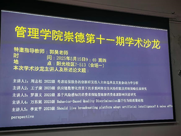 分会场7-536教室,宋琬婷同学介绍了《基于SMOTE-SVM的多准则库存分类》,提出了一种改进的库存分类模型。洪子涵同学分享了《Co-opetition strategies in supply chains with strategic customers》,分析了制造商与原始设备制造商之间的竞合策略。高旻同学探讨了《基于政府不同补贴形式下的绿色产品制造商渠道选择策略分析》,研究了政府补贴对制造商渠道选择的影响。