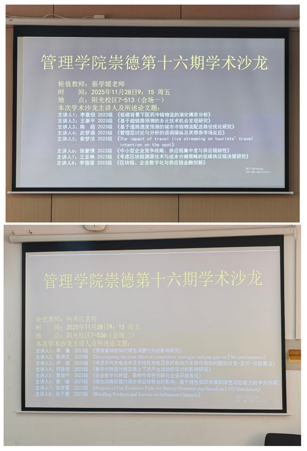 2025年11月28日上午,WilliamHILL中国第16期“崇德”学术沙龙分别在阳光校区7-513教室和7-536教室如期举行。本次沙龙特邀蔡学媛老师和何秀红老师担任评委老师,对16位主讲人最新的学术研究分享进行点评。