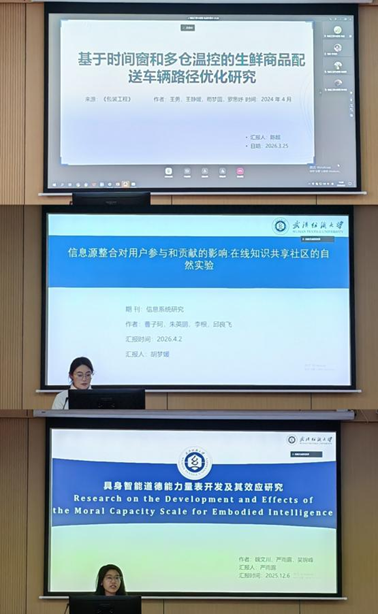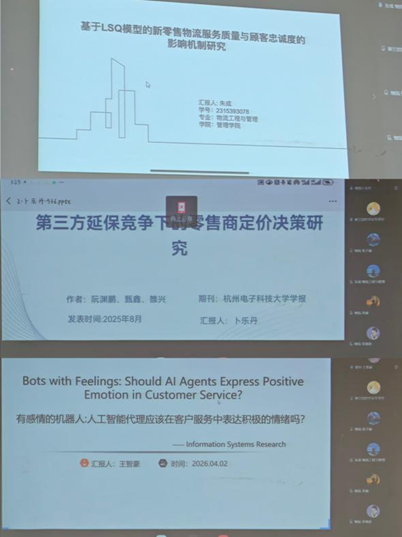 陈超同学分享的论文《基于时间窗和多仓温控的生鲜商品配送车辆路径优化问题》针对生鲜配送痛点构建双目标路径优化模型,设计CW-NSGA-II混合算法,验证后实现车辆数和运营成本的大幅降低,为生鲜配送提供决策支持。胡梦媛同学汇报了论文《信息源整合对用户参与和贡献的影响:在线知识共享社区的自然实验》,以知乎自然实验为背景,发现平台整合异质内容的信息源呈现方式,会因认知压力、激励削弱等原因降低用户的参与度与贡献量。严雨露同学汇报的论文《具身智能道德能力量表开发及其效应研究》,运用扎根理论开发具身智能道德能力量表,证实其含三大维度且正向影响消费者使用意愿,能力与温暖感知起中介作用、社会影响起调节作用,为伦理治理提供支撑。